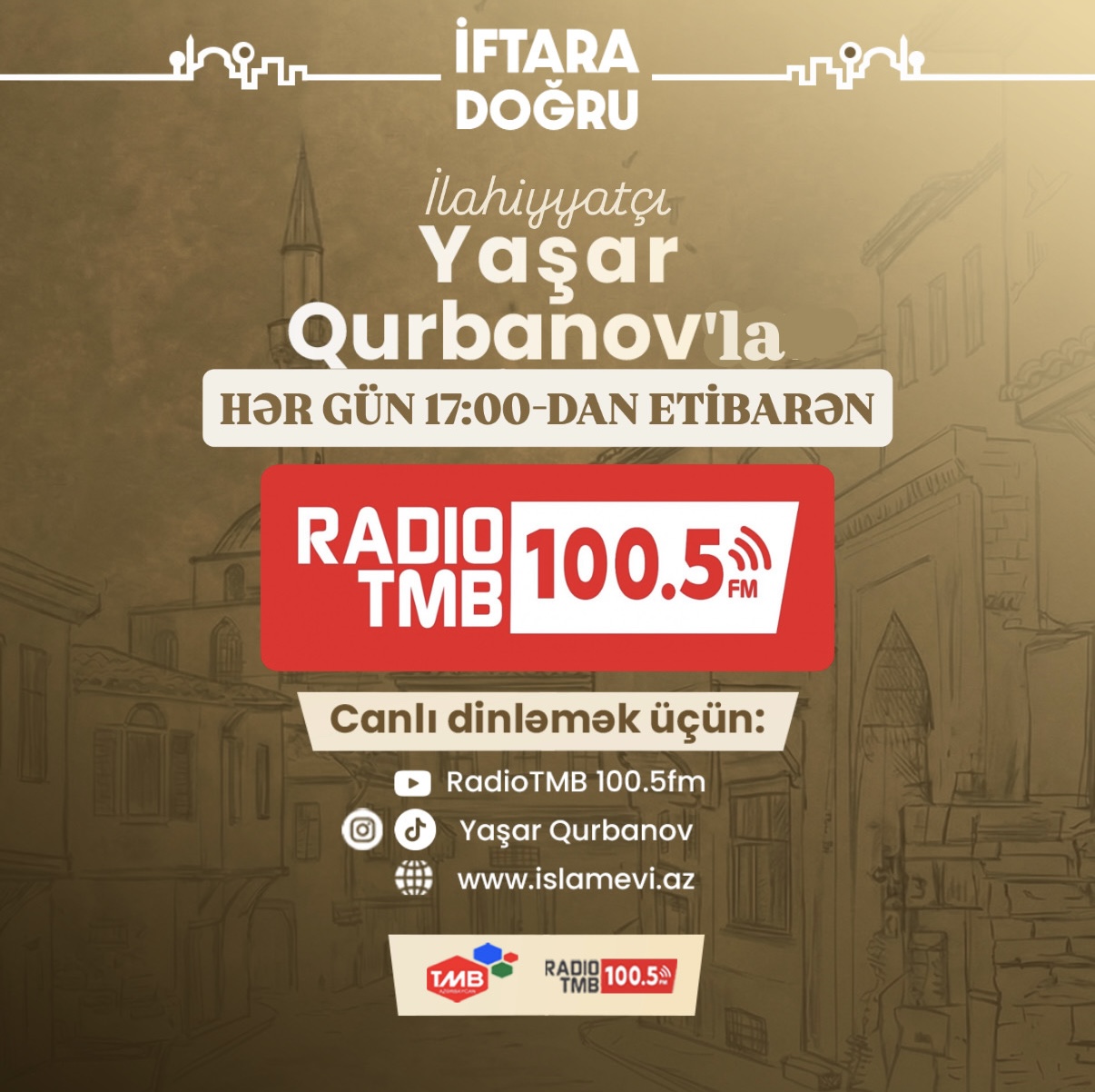 Hörmətli izləyicilərimiz! 18 Fevral 2026-ci ildən etibarən hər gün 17:00-dan etibarən TMB FM-də (100.5 fm | Bakı) “İftara doğru” verilişini dinləyə bilərsiniz.